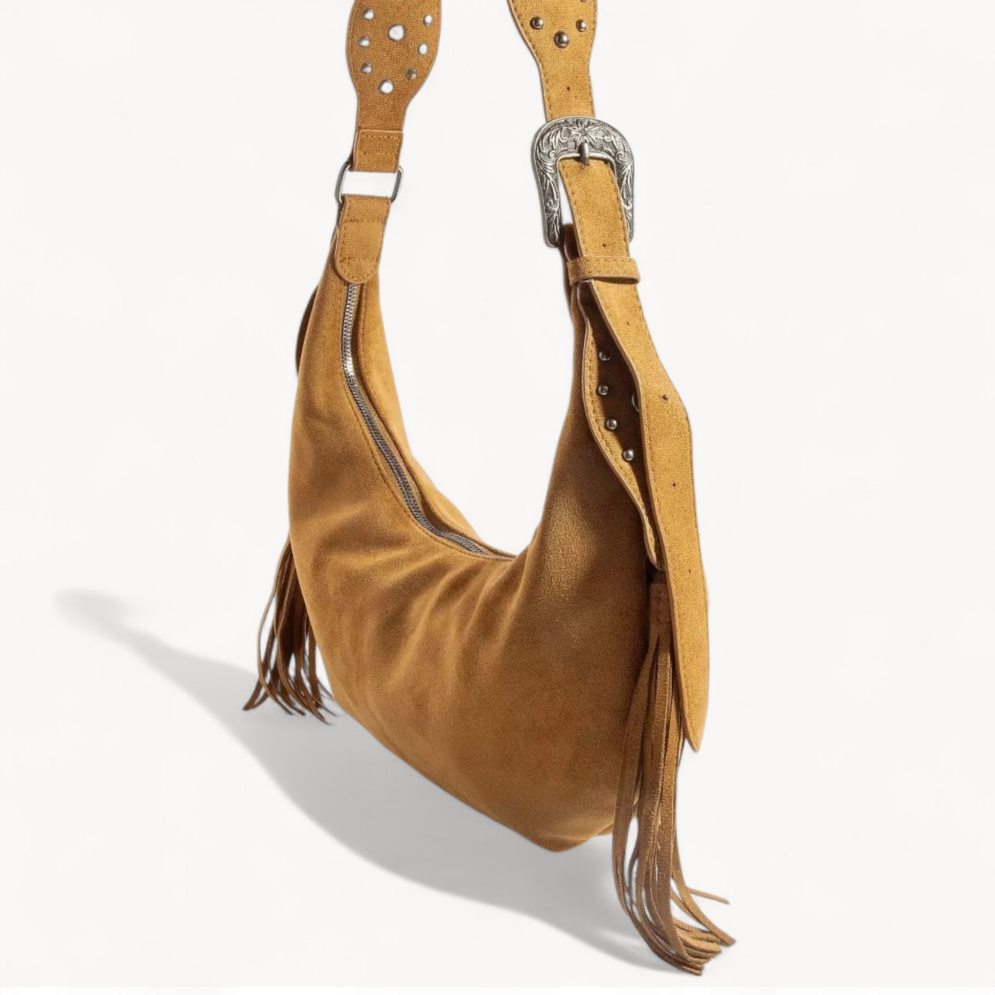 Embrace your inner free spirit with the Desert Ridge Hobo Bag, a crescent-shaped companion that brings Western-inspired flair to every adventure. This medium-sized beauty combines bohemian charm with practical style, featuring eye-catching fringe details and a sturdy buckle strap that keeps up with your lifestyle. Crafted from a durable polyester and alloy blend, the spacious interior holds everything you need while the comfortable shoulder carry makes it perfect for all-day wear. Whether you're heading to the market, a music festival, or a weekend getaway, this playful hobo bag delivers boho-chic vibes with an edgy Western twist that turns heads. The unique crescent silhouette sets it apart from ordinary bags, making it the perfect statement piece for anyone who refuses to blend in. The fringe detailing adds movement and personality, while the reliable buckle strap ensures your essentials stay secure. Pair it with your favorite denim, flowing skirts, or festival wear for an effortlessly cool aesthetic that celebrates individuality and adventure. Measurements: 14"L x 3"W x 6.5"H. Material: 90% Polyester, 10% Alloy. Imported.