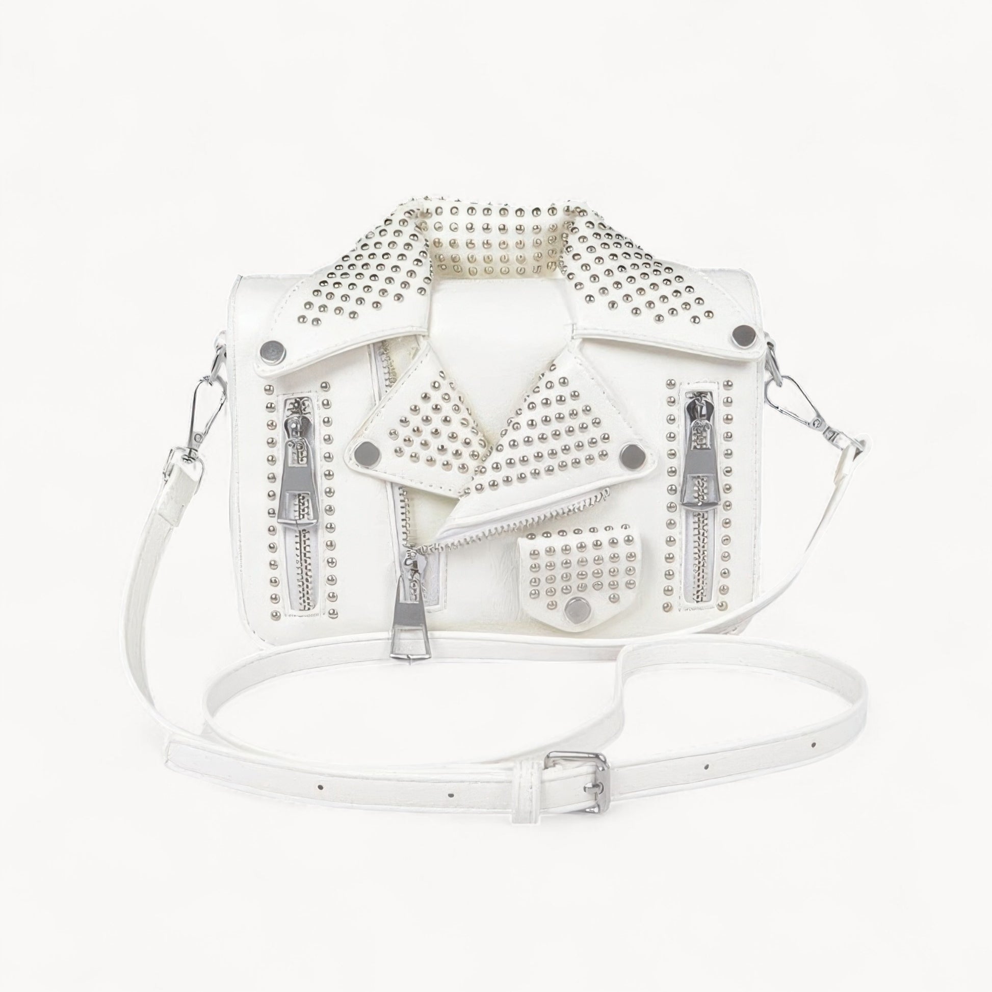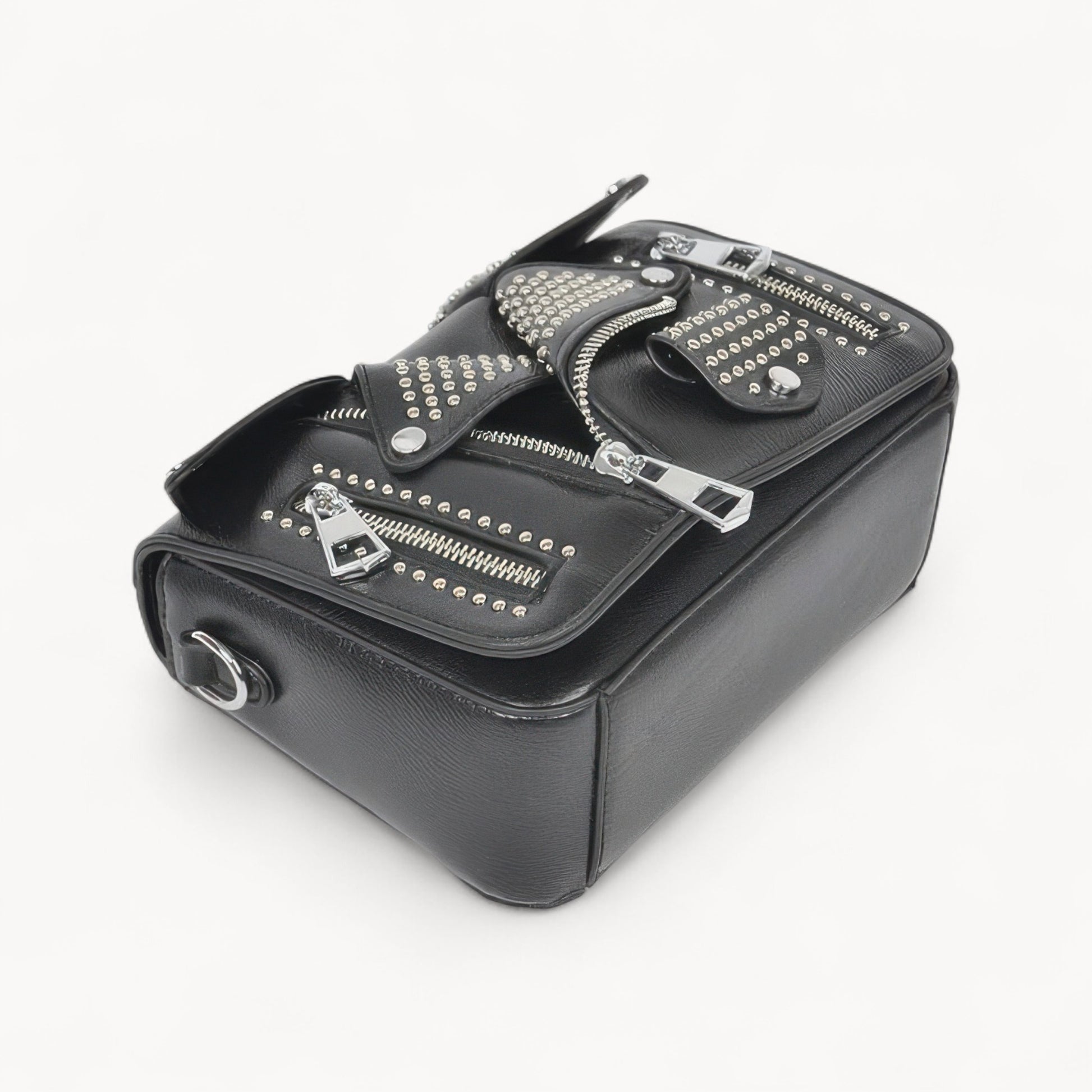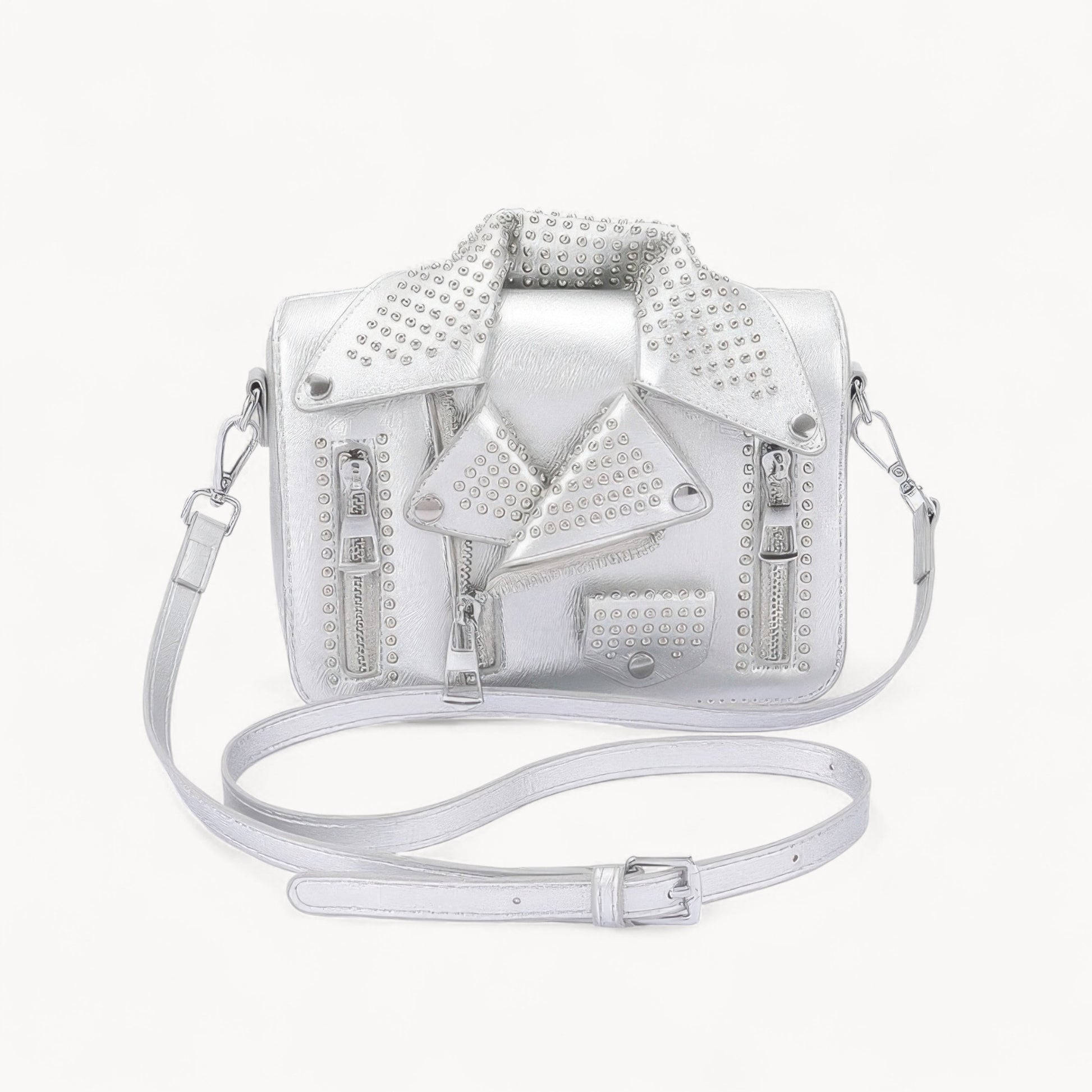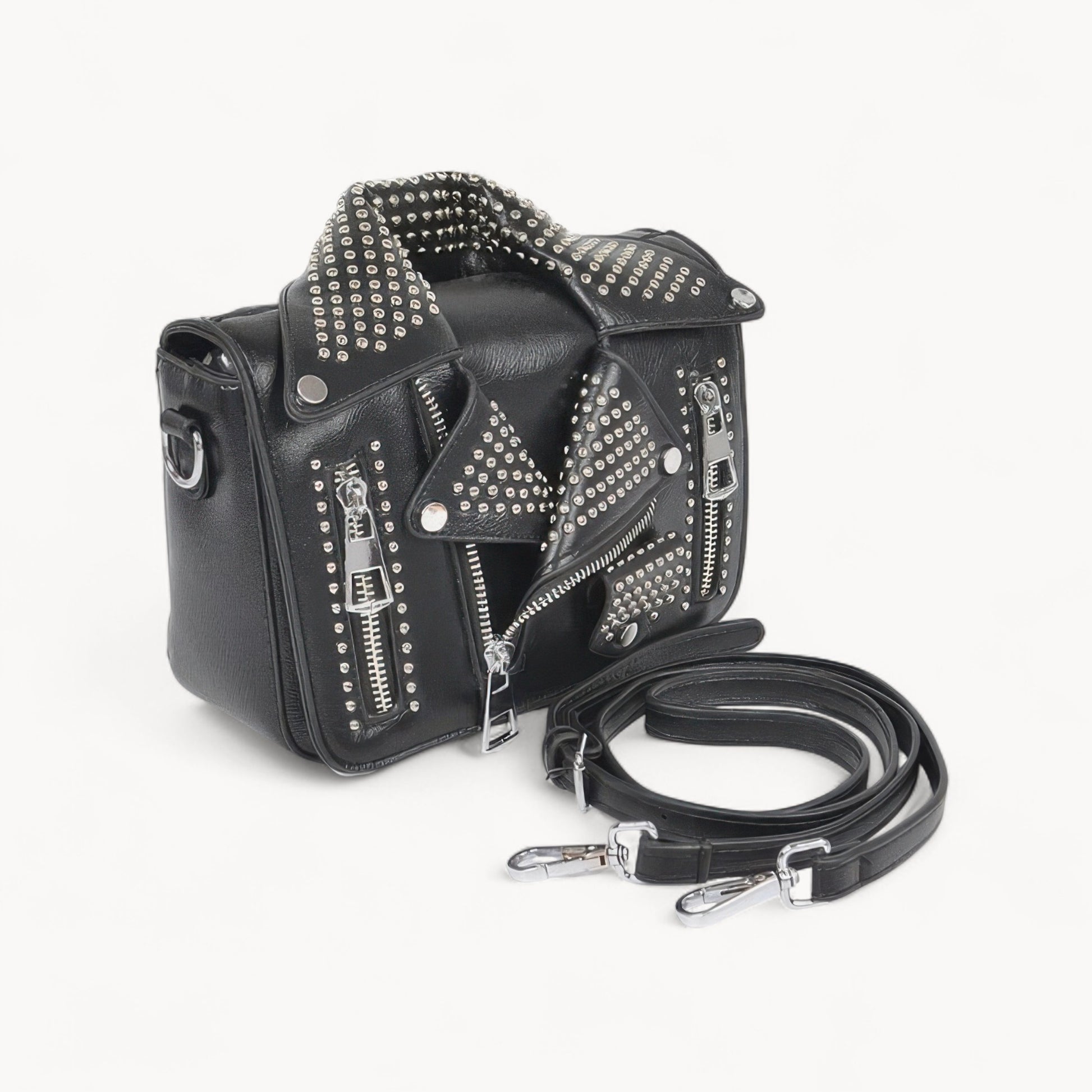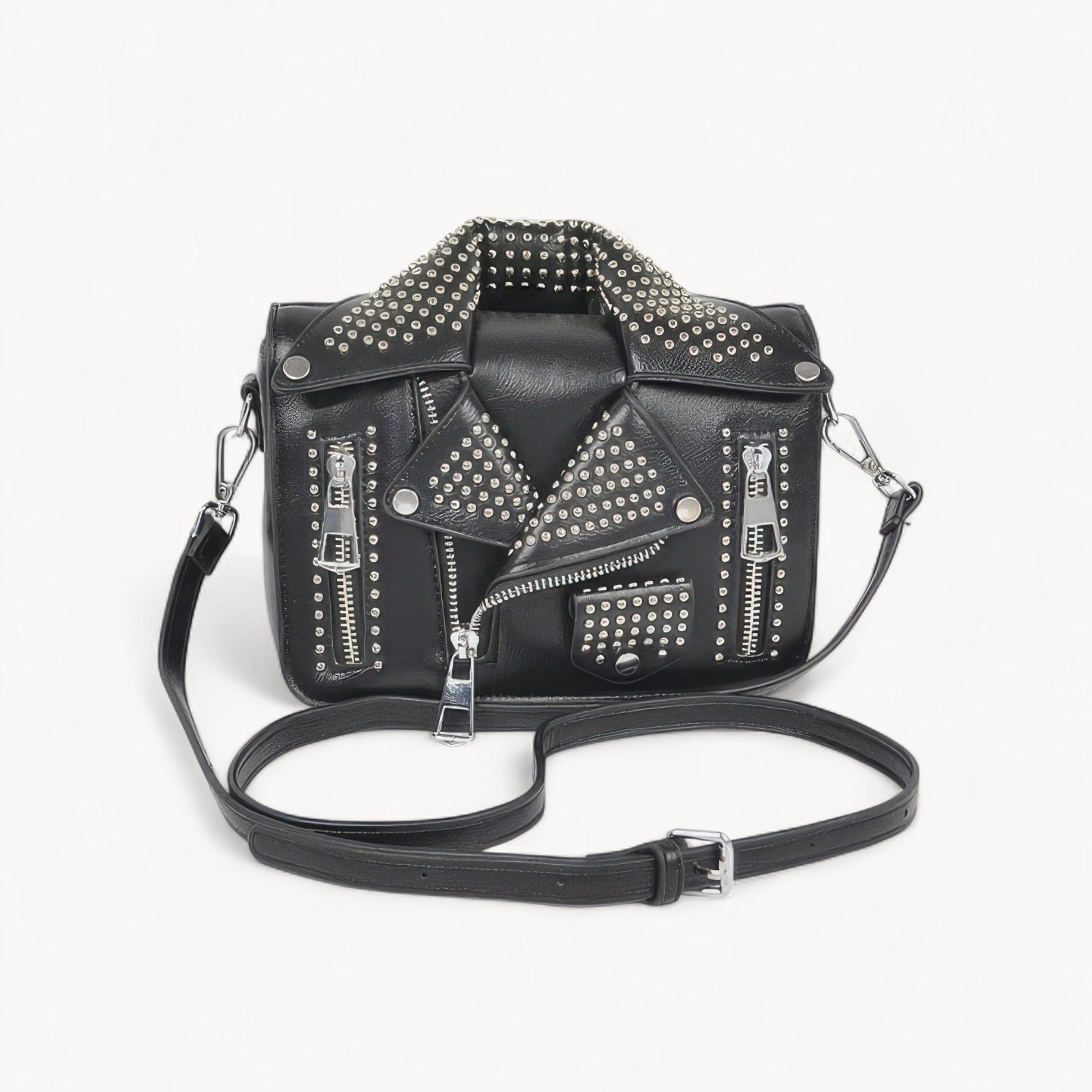 Channel edgy glamour with the Faux Leather Metal Studded Jacket Clutch. Inspired by statement outerwear, this clutch features bold studded detailing on smooth faux leather. Compact and stylish, it’s the perfect piece to add a rock-chic twist to any look.