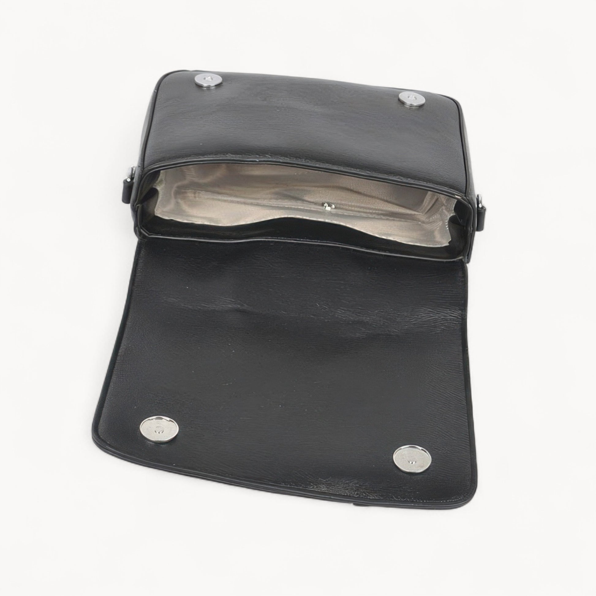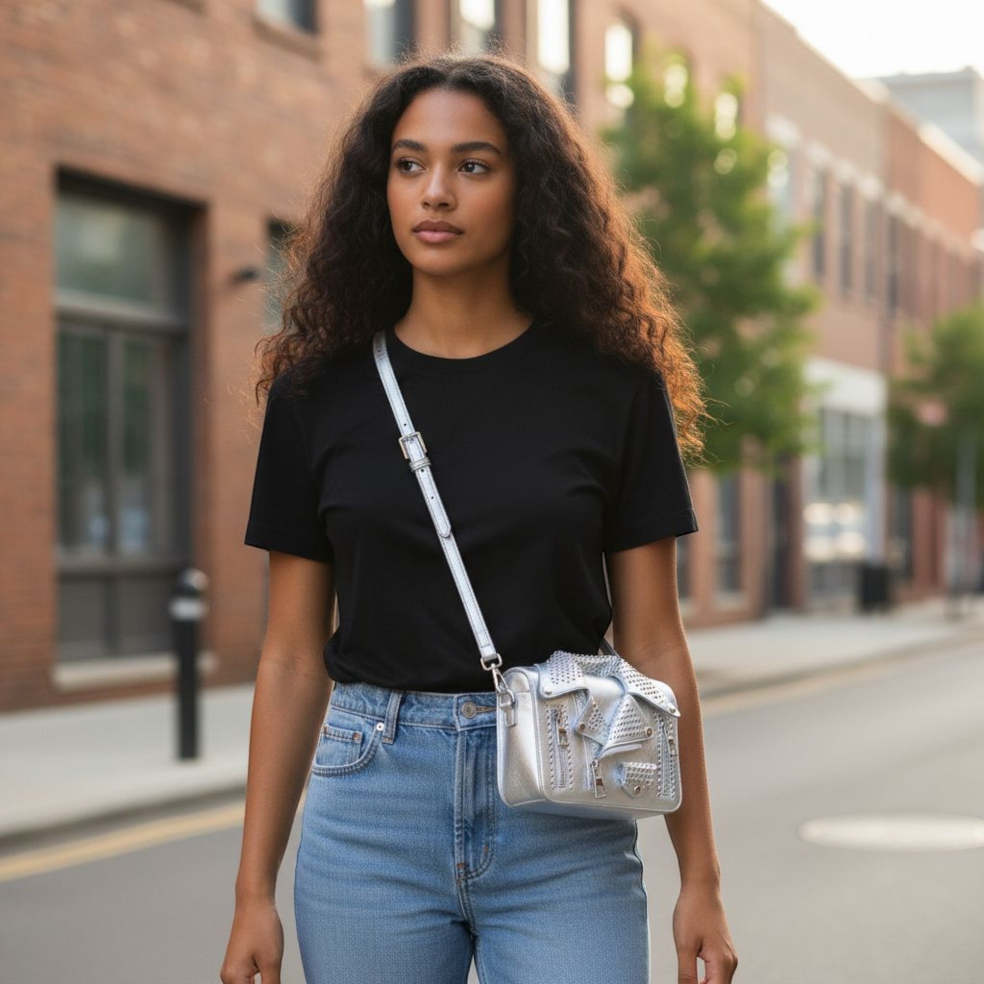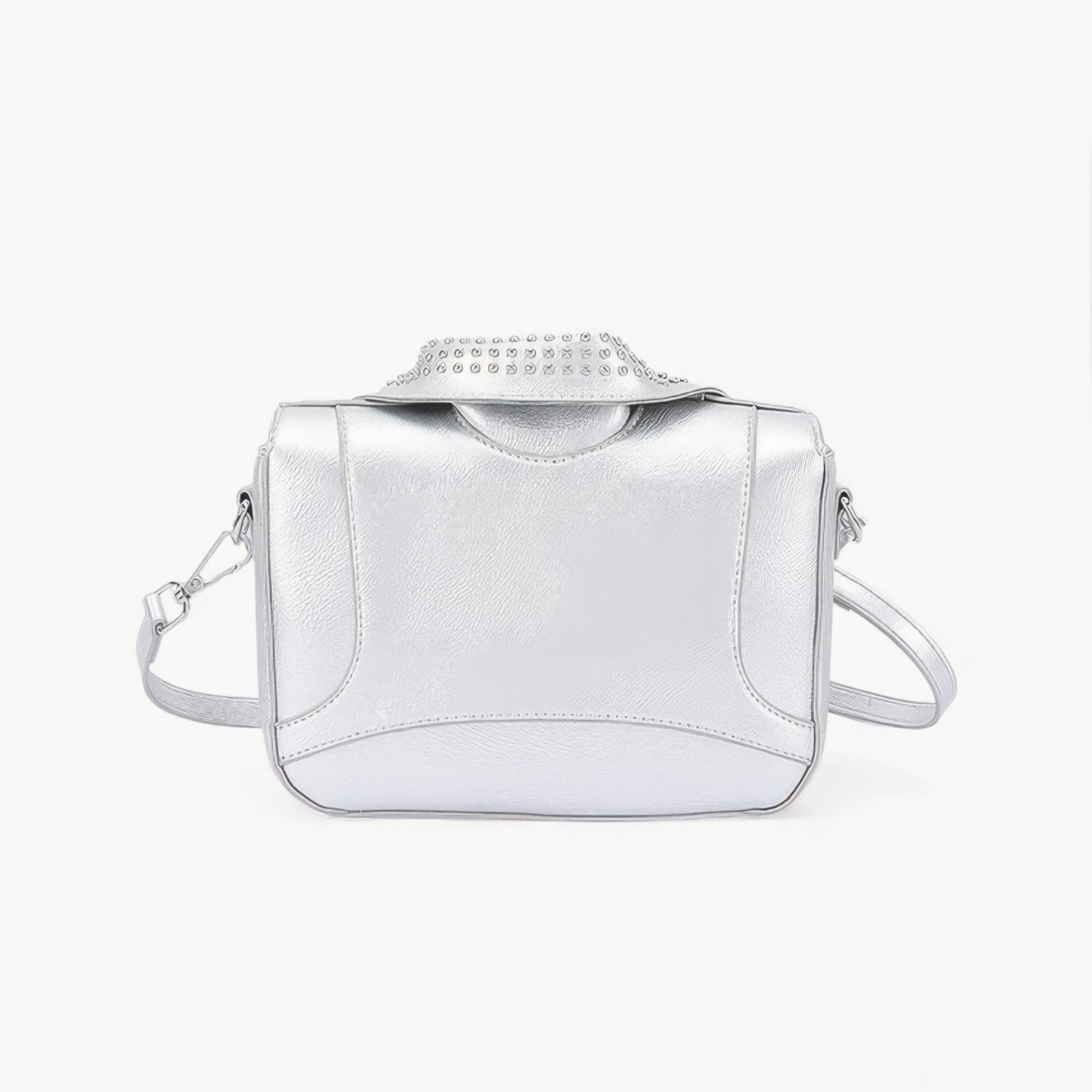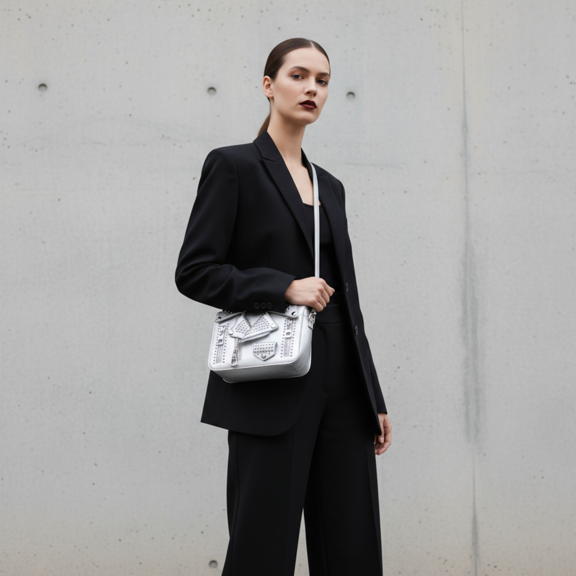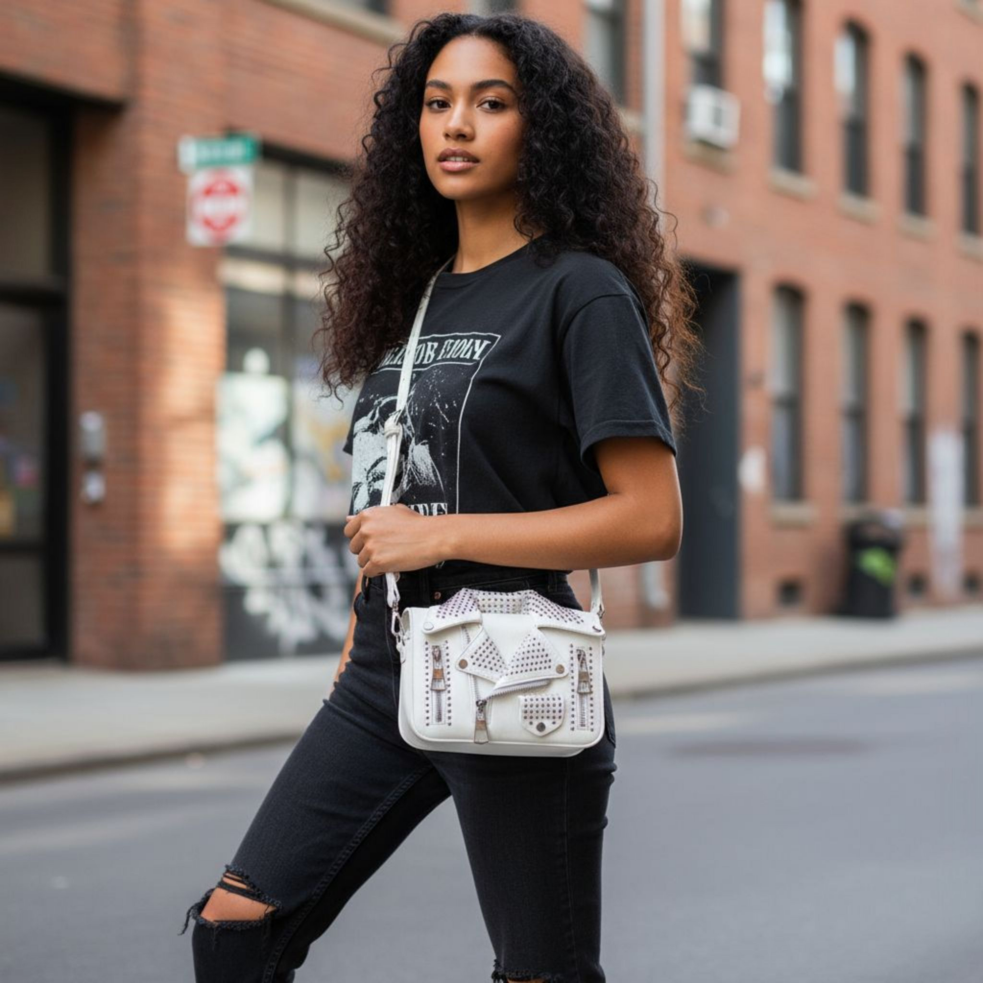 Channel edgy glamour with the Faux Leather Metal Studded Jacket Clutch. Inspired by statement outerwear, this clutch features bold studded detailing on smooth faux leather. Compact and stylish, it’s the perfect piece to add a rock-chic twist to any look.