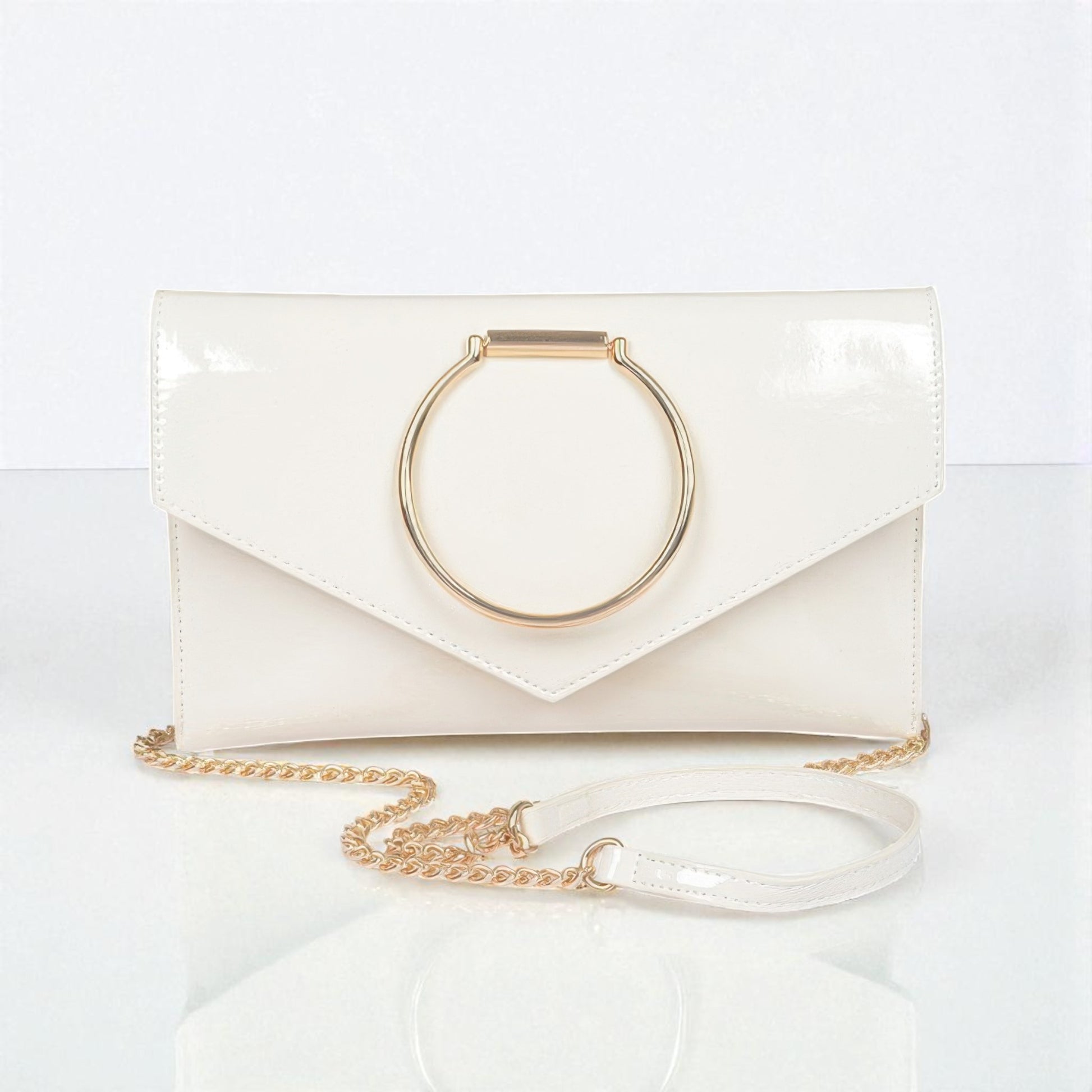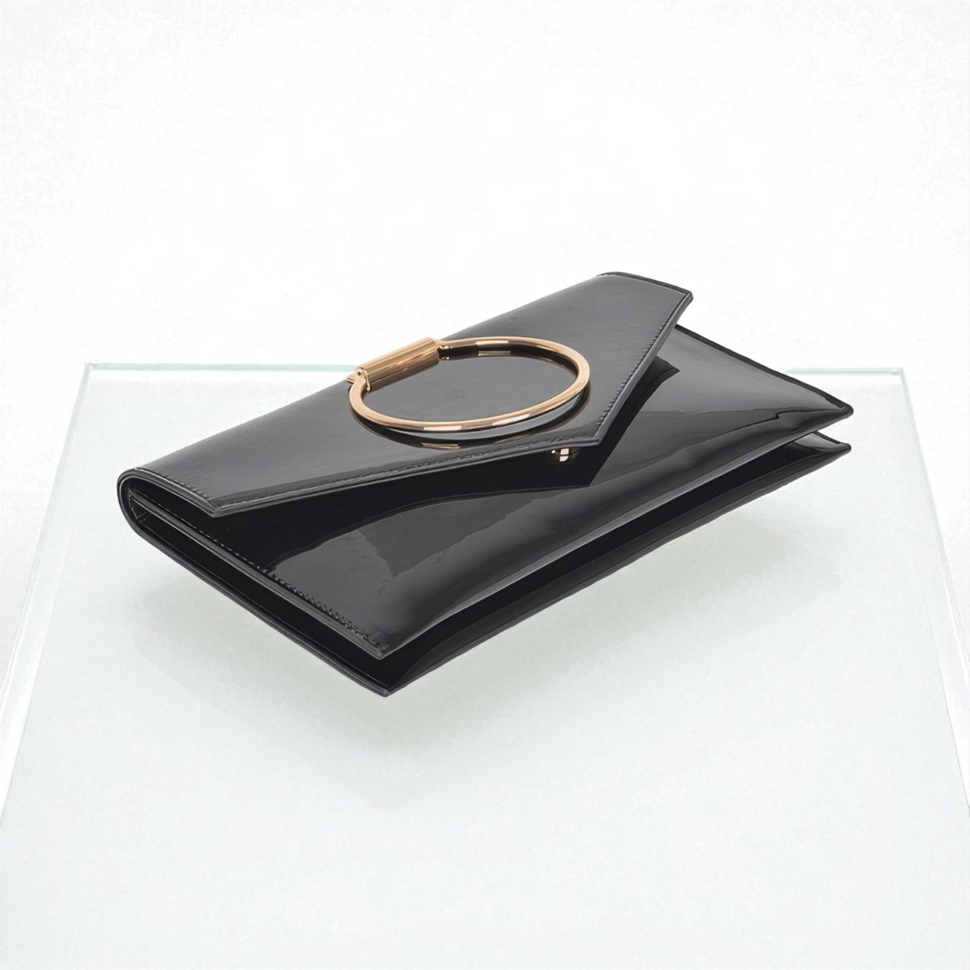 Chic and contemporary, the Enamel Faux Leather Metal Handle Flap Clutch is the ultimate accessory for polished evenings out. Crafted from glossy faux leather, this sleek clutch features an envelope-style flap and a bold metal ring handle that doubles as a striking design detail and practical grip. A detachable chain strap allows for hands-free styling when needed. With its structured silhouette and modern finish, this piece brings an elevated edge to both formal and cocktail attire. Designed to balance fashion-forward aesthetics with everyday functionality, it’s a must-have for your evening collection.