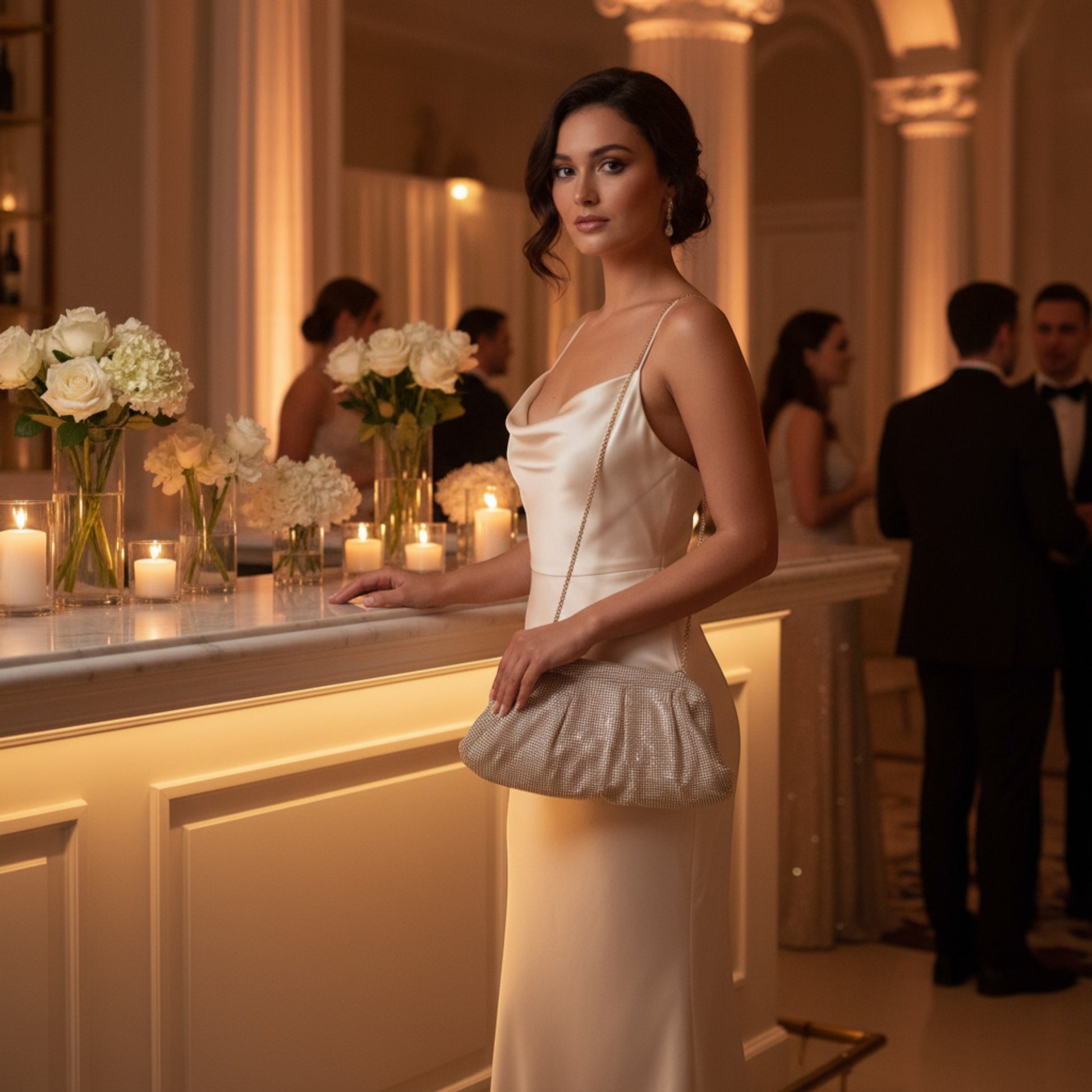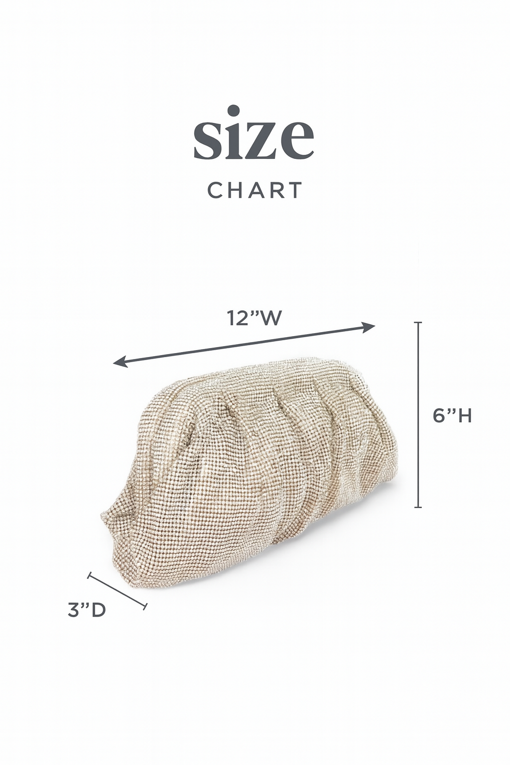 Shine effortlessly with the Glamora Pleated Rhinestone Evening Clutch, a radiant statement piece designed to complement your most elegant moments. Covered in light-catching rhinestones, its softly pleated silhouette blends glamour with timeless sophistication. The satin-lined interior offers space for essentials like your phone, lipstick, and cards, while the detachable gold chain strap allows for versatile styling β wear it as a shoulder bag or carry it as a clutch. Perfect for weddings, galas, or any occasion that calls for a little extra sparkle, this bag brings refined luxury to every outfit.